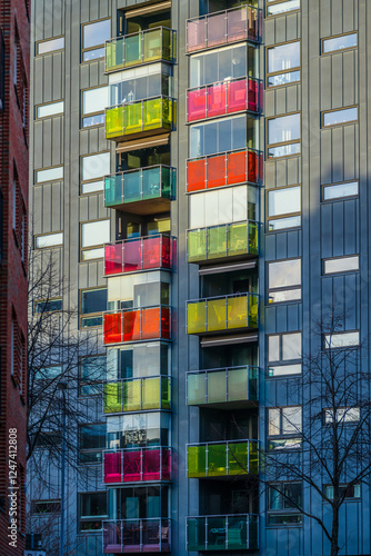 Fototapeta premium colorful balconies on modern residential building with glass panels.