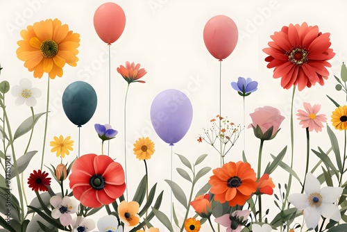 Fototapeta premium Colorful balloons floating among vibrant flowers, creating a whimsical garden...