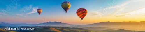 © BajimBa, Naklejka premium Colorful balloons floating in the sky over beautiful landscapes symbolizing freedom and adventure