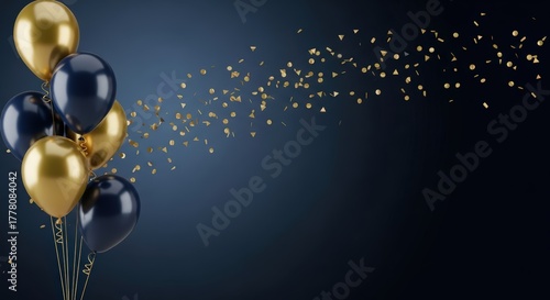 Obraz premium Colorful balloons in gold and navy blue with confetti scattered against a...