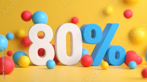 Naklejka premium Colorful balls surround large numbers showing eighty percent in a bright space