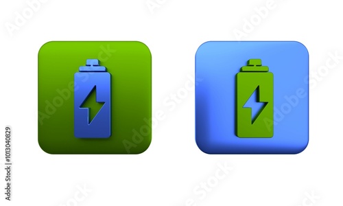© Vadim, Fototapeta premium Colorful Battery icon isolated on white background. Lightning bolt symbol. Square button. 3D render illustration
