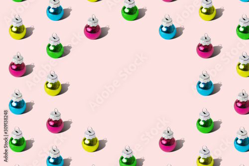 Obraz premium Colorful baubles Christmas decoration pattern on pastel background minimal...