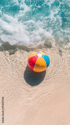 © cac_tus, Obraz premium Colorful beach ball on sand with ocean waves, summer vacation concept