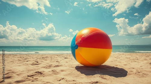 © thenort, Obraz premium Colorful beach ball on sandy shore. Sunny day. Potential use for summer vacation posters