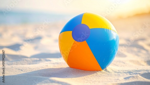 © Arianto, Obraz premium Colorful beach ball on sandy shore with ocean waves and sunlight glow