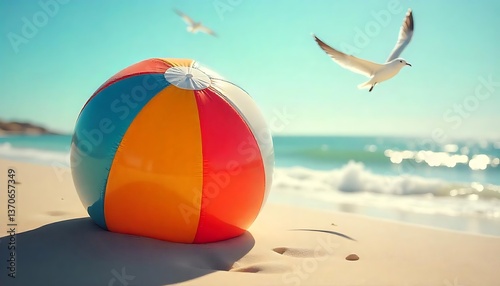 © sasongko, Obraz premium Colorful Beach Ball on Sandy Shore with Seagulls and Ocean Waves