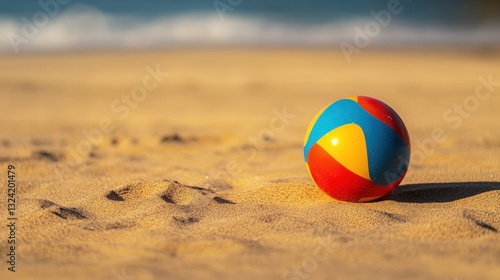 © musa, Obraz premium Colorful beach ball rests on sandy beach near ocean.