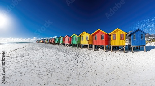 Naklejka premium Colorful Beach Huts Line Sandy Shore Under Blue Sky