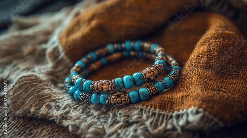 © Boonnam Burart, Fototapeta premium Colorful Beaded Bracelets on Fabric Surface