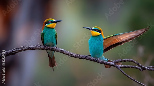 © James, Obraz premium Colorful bee-eater bird and blue tit wildlife on a vibrant green tree branch, showing beautiful feather and beak