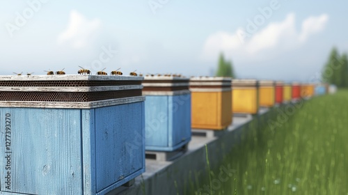 © Digital Design, Fototapeta premium Colorful beehives lined up in a grassy field under a clear sky, showcasing a tranquil and productive beekeeping environment.