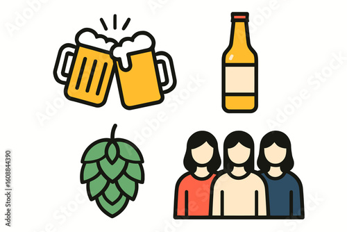 Fototapeta premium Colorful Beer Icons Featuring Cheers, Bottle, Hop Leaf, and Group of People Illustration