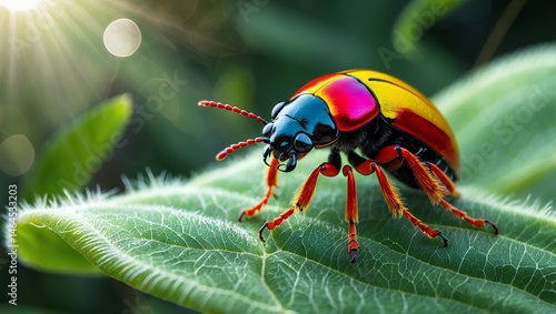 © Tina, Fototapeta premium Colorful Beetle on Green Leaf
