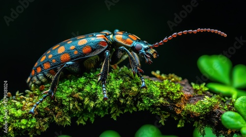 Naklejka premium Colorful beetle on mossy branch, rainforest detail