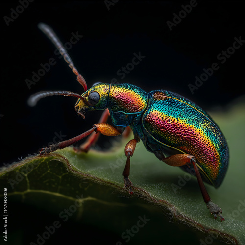 Naklejka premium Colorful beetle resting on a leaf in a dark environment during daytime
