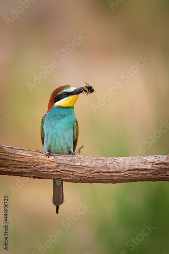 © serkanmutan, Fototapeta premium Colorful bird and its hunt. Yellow green nature background. Bird: European Bee eater. Merops apiaster.