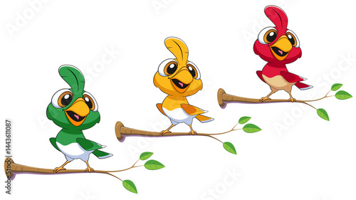 Obraz premium colorful bird characters resting on a tree branch and isolated on white...