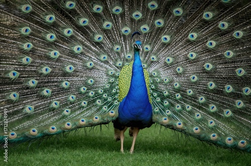 © The 2R Artificiality, Obraz premium Colorful bird displaying plumage in a natural garden setting, pattern and design elements with green and blue hues