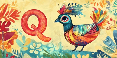 Fototapeta premium Colorful bird, letter Q, abstract floral background.