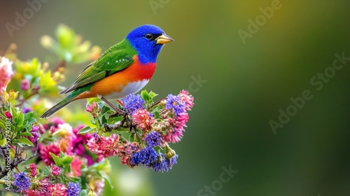 © BerkahStock, Fototapeta premium Colorful Bird Perched on Blooming Branch
