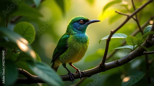 © Synthetic Stock Lab, Fototapeta premium Colorful bird perched on branch in lush forest