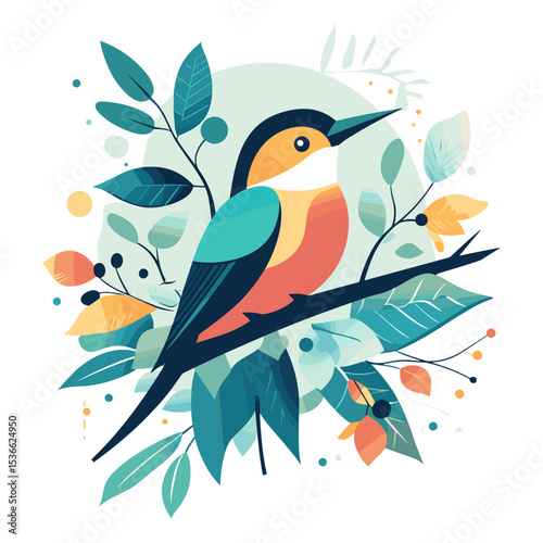 Obraz premium Colorful bird perched on branch surrounded by leaves and flowers