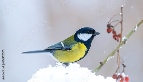© Muhammad, Obraz premium Colorful bird perched on snowy branch with red berries against a blurred white, wintry background