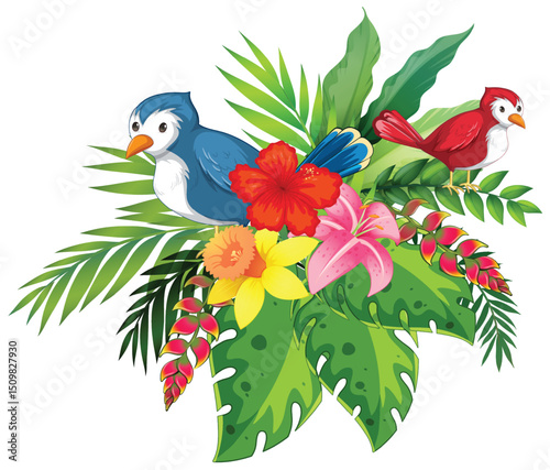Obraz premium Colorful Birds and Tropical Flower Arrangement