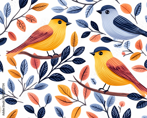© Lala Farikha, Fototapeta premium Colorful birds perched on autumn branches, seamless pattern
