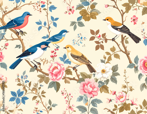 Fototapeta premium Colorful Birds Perched on Branches Amidst Floral Pattern Design