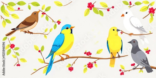Fototapeta premium Colorful Birds Perched on Branches with Berries