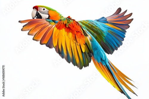 © inas, Fototapeta premium Colorful blue and yellow macaw parrot flying with wings spread wide