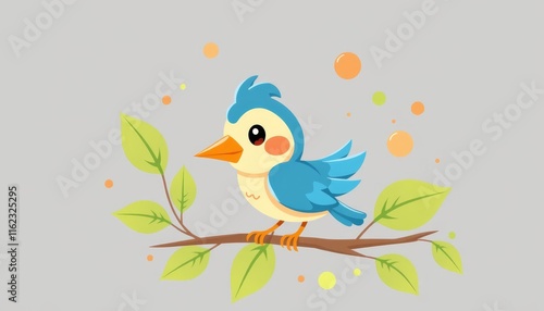 © Andrey, Naklejka premium Colorful blue bird perched among vibrant green leaves in a whimsical setting