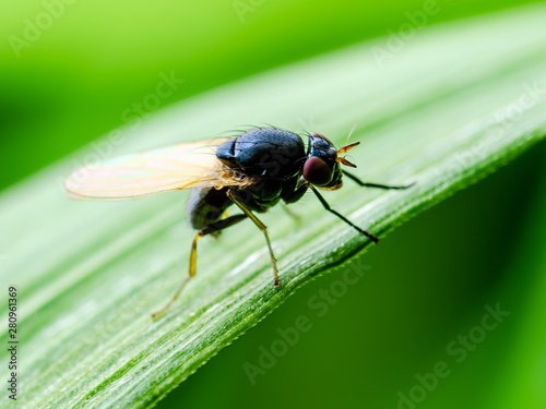 Naklejka premium Colorful Blue Fly Drosophila Diptera Insect on Green Grass Macro