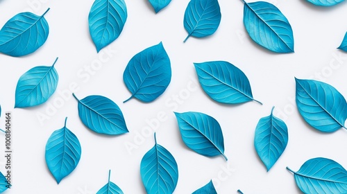 © Naphol, Fototapeta premium Colorful blue leaves arranged on a white background.