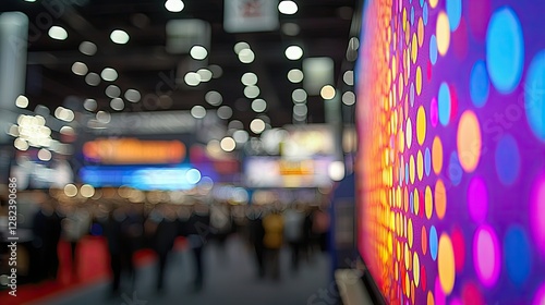 Fototapeta premium Colorful Blurred Bokeh Lights at a Busy Exhibition with Attendees in a Modern Convention Center