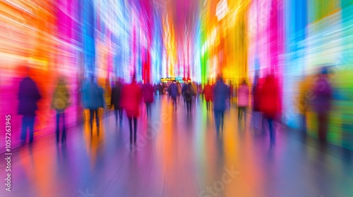 Fototapeta premium Colorful Blurred Motion, People Walking in a Dynamic, Modern Hallway,...