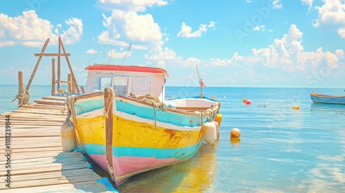 Fototapeta premium Colorful Boat at Pier: A vibrant, weathered boat, painted in eye-catching hues, gently rests alongside a wooden pier, set against a backdrop of the tranquil sea and a clear, cloud-dappled sky.