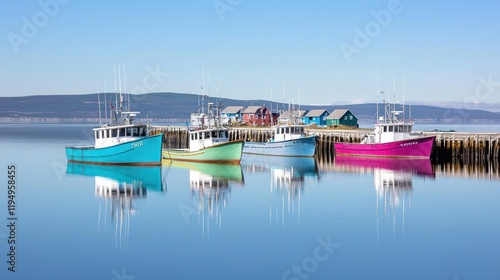 Fototapeta premium Colorful boats docked by a serene waterfront under clear skies.