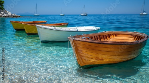 © Shiroo, Naklejka premium Colorful Boats Floating on Calm Blue Water