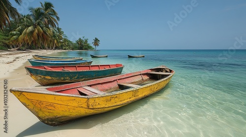 © ALIF JATI KUSUMA, Naklejka premium Colorful boats on a tranquil beach.