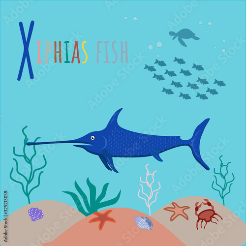 Obraz premium Colorful book alphabet. Xiphias fish. Book of animals. Letter X