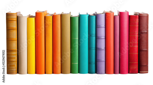 Fototapeta premium Colorful books are standing in a row sorted by color from light to dark creating a vibrant gradient effect on a transparent background, perfect for educational or literary themes