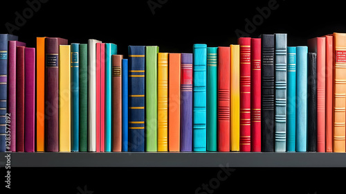 Fototapeta premium Colorful Books Arranged Neatly on Dark Shelf Isolated Against Black Background