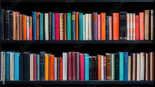 © julio, Fototapeta premium Colorful Books Arranged Neatly on Two Dark Wooden Bookshelves in a Home Library Setting with a Focus on the Vibrant Book Spines