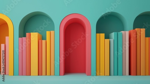 © pattaphorn, Fototapeta premium Colorful Bookshelves with Arches and Bright Colors