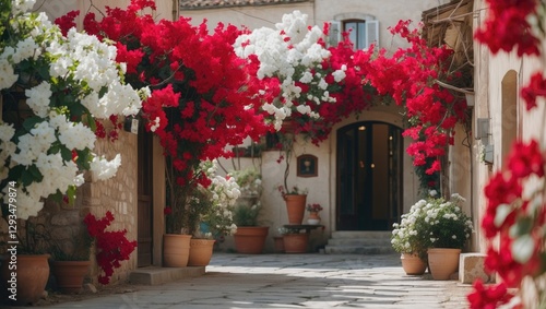 © AbstractAI, Naklejka premium Colorful Bougainvillea Flowers in a Quaint Village Alley with Cobblestone Path and Abundant Greenery Ideal for Text Overlay