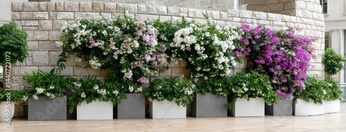 Fototapeta premium Colorful bougainvillea garden highlighting vibrant flowers against an old stone wall on a wooden floor during summer season