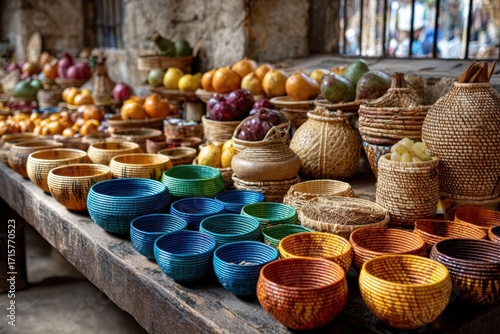Fototapeta premium Colorful Bowls and Baskets with Fruits on Wooden Table